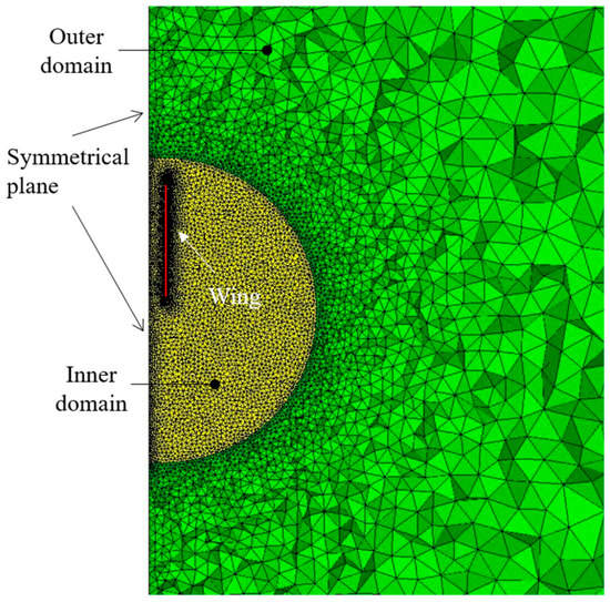 In order to simulate the flapping motion, the mesh nodes on the wing must be updated at each time step using a user-defined function—a dynamic mesh feature in ANSYS Fluent. Consequently, the volume mesh must be remeshed. As shown in Figure 8, the volume mesh in the inner domain, which is directly attached to the wing, is much finer than the outer domain. In other words, it is of a high-density region. With the existence of the inner domain, the remeshing process focuses mainly on the elements in this domain, providing two benefits. First, the size of 3-D elements in the high-density region can be maintained during the remeshing process without remarkably increasing the number of elements. Second, the remeshing time is reduced, leading to a shorter computational time per time step.