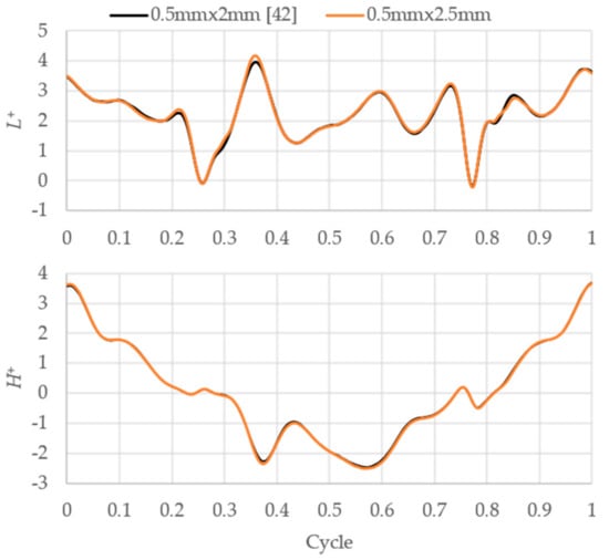 The grid-independence test with the same wing was reported in Ref. []. The grid size of the CFD model was determined by the element sizes on the wing surface (s1) and in the high-density region (s2). In Ref. [], three grids corresponding to three sets of s1 and s2, namely, grid 1 (1 mm × 4 mm), grid 2 (0.75 mm × 3 mm), and grid 3 (0.5 mm × 2 mm) were tested. The aerodynamic forces at hovering were computed using the three grids. The former work shows that except for the slight differences in the force peaks, the time courses computed from the three grids were almost the same. Therefore, grid 1 could be considered grid independent. In the current work, we used the set of 0.5 mm × 2.5 mm which resulted in a finer mesh than grid 2. Moreover, the computational domain’s size of the current CFD model was also larger than that of the former work. Therefore, the current mesh could provide a converged solution. The time courses of the non-dimensional lift (L+) and horizontal force (H+) at hovering from the current mesh and from the grid 3—the finest mesh—are shown in Figure 11. The lift was in z-axis, i.e., normal to the stroke plane, and the horizontal force was in x-axis (see Figure 5a for the coordinate system). All forces were made non-dimensional by the reference force Fref = ρ(2ΨfRm)2S, where ρ is the air density (1.225 kg/m3), and S is the area of one wing (0.0017 m2). Hence, L+ = L/Fref and H+ = H/Fref where the superscript “+” indicates a non-dimensional quantity. As shown in Figure 11, except for slight differences in peaks of lift, the time courses for the two meshes were almost the same.