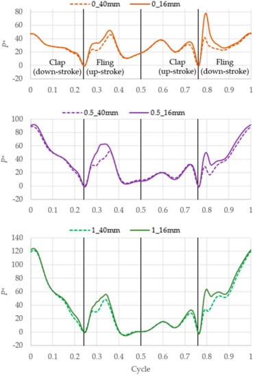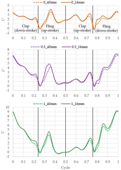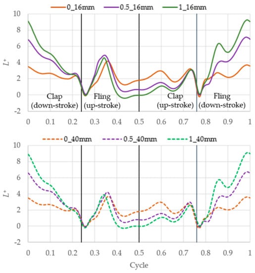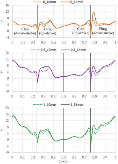 The time courses of torque and power consumption for various inflow speeds are plotted in Figure 15 and Figure 16, respectively. Similar to the lift, for all inflow speeds, there are increments in torque and power consumption in case of 16 mm compared to the case of 40 mm. The augmentations occur mainly during stroke reversal. The periods of augmentation in fling phases are longer than those in clap phases.