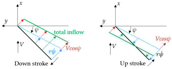 The non-dimensional lifts are rearranged in two groups corresponding to two wing distances and plotted in Figure 13. The total inflow to a wing is the combination of the free-stream inflow and the inflow due to flapping motion (Figure 14). The free-stream inflow augments the total inflow during the down stroke and reduces it during the up stroke. As a result, when J increases from 0 to 1, the lifts in down-stroke phases increase while those in up-stroke phases decrease. Moreover, the contribution of the free-stream inflow to the total inflow is proportional to the term cosψ, which means that the influence of the free-stream inflow is largest around the middle of strokes where the flapping angle ψ is 0 and cosψ equals to 1. This explains why the differences between time courses are largest around the middle of strokes. Because the increased amount in the down stroke is larger than the reduced amount in the up stroke, the average lift over a flapping cycle increases with the increment of the inflow speed. This trend is applicable for both cases of wing distance, and agrees well with previous study on insect flight in forward/backward disturbance [].