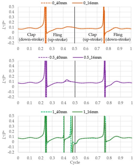In this work, the aerodynamic efficiency is represented by lift-to-power ratio (L+/P+). The time courses of L+/P+ are plotted in Figure 17. For all investigated inflow speeds, L+/P+ for the two wing distances are almost the same over the flapping cycle.