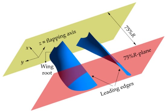 To explain why the force and torque trends observed in Section 3 occur, first, we investigated how the short wing distance—corresponding to a strong clap-and-fling effect—augments the force and torque generation. For this purpose, the pressure and flow velocity during the stroke reversal—the interval when the wing–wing interaction occurs—were examined. Because it is hard to interpret these flow fields in three-dimensional (3-D) view, the flow fields in 75%R-plane were plotted. As shown in Figure 18, the 75%R-plane is normal to the x-axis, located 75% wing length from the wing root (see Figure 5a for the coordinate system). As shown in Figure 3, the leading edges of the two wings are closest near the tip, implying that the clap-and-fling effect is strongest around this area. However, the clap-and-fling effect at the tip may be weak than the inner due to short local chord length. Therefore, the position of 75%R was chosen for the flow visualization.