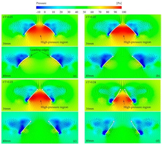 The flow fields in 75%R-plane for J = 1 during down-stroke clap and up-stroke fling are plotted in Figure 19 and Figure 20. The flow fields for J = 0 and J = 0.5 show similar phenomena and can be found in Supplementary Materials. Right before the stroke reversal, the flapping speed is decelerated to 0 to prepare for the next stroke. In case of 40 mm wing distance, because of slow flapping speed, the force generation during the stroke reversal is low, manifested by the low-pressure region below the wings. Because flapping speed is decelerated, the pressure field below the wing pair becomes weaker when the time progresses to the end of the clap phase. Meanwhile, for the case of 16 mm, because the leading edges of the wing pair press close to each other, the air between them is trapped. The trapped air forms a high-pressure region between the wing pair, resulting in higher force generation compared to the case of 40 mm. While the pressure field below the wings in case of 40 mm becomes weaker as time progresses, the pressure field in case of 16 mm becomes stronger. This is because the space between the two wings becomes narrower, hence the trapped air tends to be more compressed. Moreover, due to inertia force resulted from wing mass, the wing camber changes from curve-up (Figure 19a,b) to curve-down (Figure 19c,d). Compared to rigid wings, this configuration is more effective in pushing the trapped air out of the high-density region via the open space between the trailing edges, resulting in a stronger down-ward flow and higher lift generation. Because the force enhancement in clap phase is mainly due to the trapped air between the two wings, it occurs in only a short time near the end of a stroke when the two wings approach, manifested by the short period of lift and torque augmentations prior to the stroke reversal shown in Figure 12 and Figure 15.
