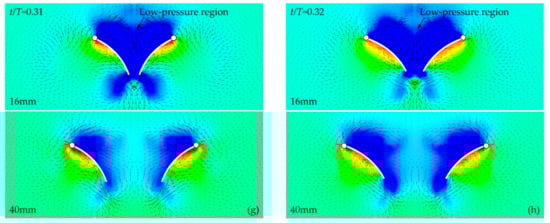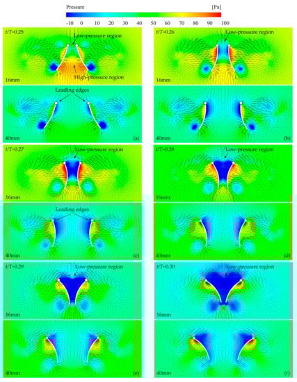 The flow fields in 75%R-plane during the up-stroke fling for J = 1 are plotted in Figure 20. During the fling phase, the leading edges move away while the trailing edges approach. In case of 16 mm, the fling motion implemented in camber wing effectively pushes down the trapped air between the wing pair, creating a strong down-ward flow below the wings and enhances the lift generation (Figure 20a–f). Moreover, the fling-open motion rapidly expands the volume between the wings, creating a low-pressure region between them. Because the leading edges separate before the trailing edges, the low pressure region appears firstly near the leading edges (Figure 20a–c), then gradually expands to the whole space between the wings (Figure 20d–h). The low-pressure region increases the net pressure between the upper and lower faces of the wings, resulting in augmentation of force and torque. Because the force augmentation in fling phase bases on two mechanisms: the pushed-down trapped air during the beginning of the phase, and the low-pressure region due to expanded air volume between the wings, the augmentation period in this phase is longer than that in clap phase. Consequently, the contribution in force enhancement of the fling phase is higher than that of the clap phase.