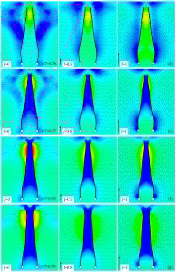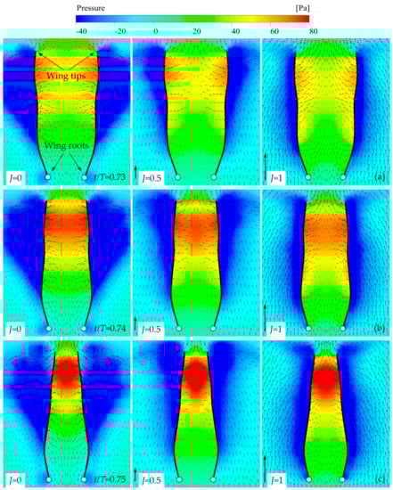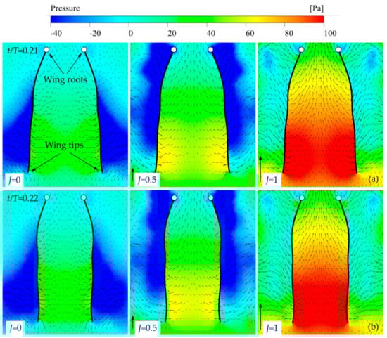 The flow fields in 25%cm-plane during down-stroke reversal for all investigated advance ratios are compared in Figure 22. As mentioned before, the force enhancement during clap phase is due to the high-pressure region between the wings, resulting from the trapped air when two wings press close to each other. In case of non-zero inflow, during down-stroke clap (Figure 22a–d), the free-stream inflow prevents the trapped air between the wings from moving out, further increasing the pressure between the wing. Consequently, the force enhancement during down-stroke clap in case of non-zero inflow is higher than that in case of hovering. When the advance ratio increases from J = 0 to 1, the amount of trapped air increases, hence the force enhancement of down-stroke clap phase also increases.