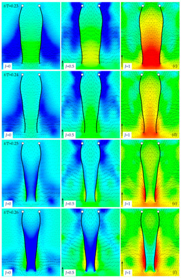 The flow fields during up-stroke reversal for all investigated inflows are shown in Figure 23. During up-stroke clap (Figure 23a–d), when the flapping angle ψ is less than 90° (Figure 23a,b), the free-stream inflow dissipates the trapped air between the wings, decreasing the force enhancement. However, when the flapping angle becomes larger than 90° (Figure 23c,d), because the wing tips are close to each other than the roots, the free-stream inflow increases the amount of trapped air, thus augmenting the force enhancement. When J increases from 0 to 0.5, the reduction in force enhancement when ψ < 90° is dominant, hence the force enhancement decreases. On the other hand, when J increases from 0.5 to 1, the augmentation in the force enhancement when ψ > 90° becomes dominant, hence the force enhancement increases compared to the case of J = 0.5. However, the force augmentation for J = 1 is still lower than that for hovering. This implies that the free-stream inflow is unfavorable to the up-stroke clap.