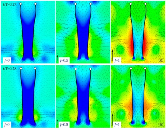 The flow fields during up-stroke fling are shown in Figure 22e–h. The force enhancement during fling phase results from two mechanisms: the pushed-down trapped air (trapped-air effect) and the low-pressure region due to expanded air volume between the wings (low-pressure-region effect). During up-stroke fling, the trapped air is pushed down, creating a strong down-ward flow below the wings. Because the amount of trapped air in case of non-zero inflow is larger than that in case of hovering, the amount of pushed-down trapped air is also larger, resulting in a higher reaction force on the wings, thus increasing the force enhancement. However, the inflow also augments the amount of air rushing in to occupy the low-pressure region between the wings, resulting in a higher pressure in the low-pressure region, thus reducing the force enhancement. When the advance ratio increases from J = 0 to 0.5, the amount of trapped air increases significantly, hence the increment of trapped-air effect is dominant compared to the decrement of low-pressure-region effect, and the force enhancement increases. Meanwhile, when J increases from 0.5 to 1, the decrement of low-pressure-region is dominant, hence the force enhancement decreases.