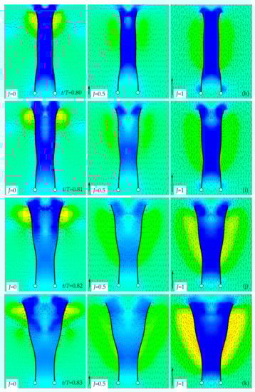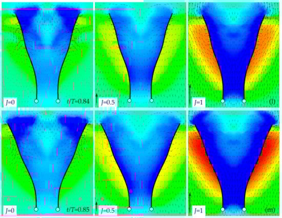 Flow fields in 25%cm-plane during up-stroke reversal; (a–d) Up-stroke clap; (e–m) Down-stroke fling. For all values of J, the wing distance is 16 mm. The wing roots are marked with white circles.