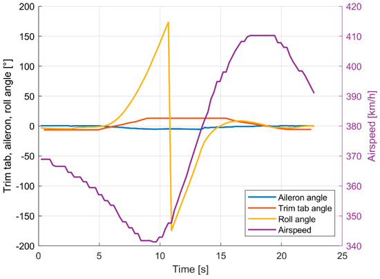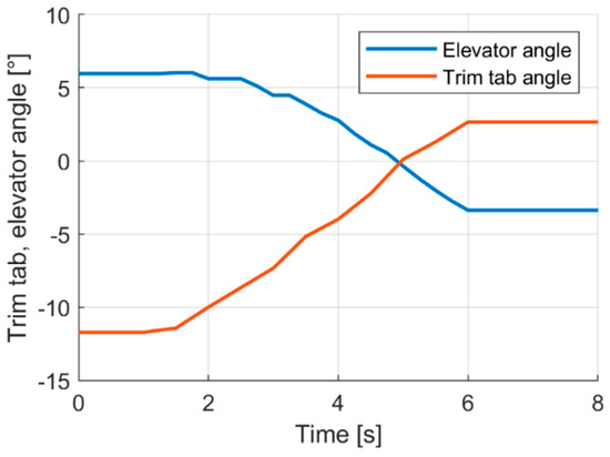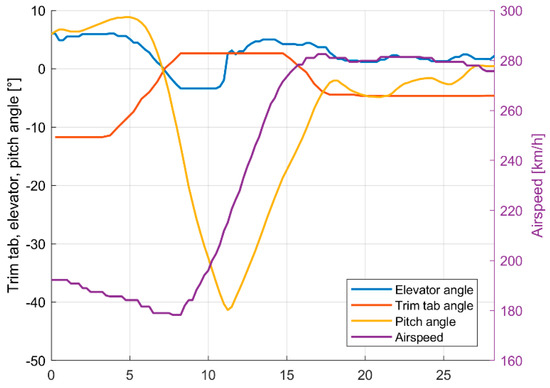 The flight parameters were recorded during the described flight tests to perform a post-flight analysis. Part of the obtained results is presented in Figure 4, showing how the elevator deflects due to its trim tab deflection. In this test, a pilot let go of the stick and controlled only the elevator trim table until 5 s; the flight was level at 185 km/h. Then, due to the aerodynamic coupling, the trim tab caused the elevator to deflect, and the aircraft began its descent.