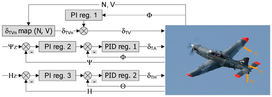 Stabilization system controller structure. Where: N—engine shaft torque, V—airspeed, Φ—roll angle, Θ—pitch angle, Ψ—yaw angle, HZ—reference altitude, ΨZ—reference yaw angle, δTVn—rudder trim tab position from the map, δTV—rudder trim tab position output, δTA—aileron trim tab position output, and δTH—elevator trim tab position output.