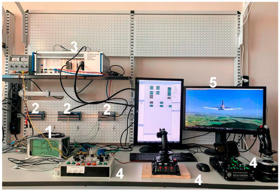 Hardware in the loop simulation test stand: 1—Device under test, 2—interface terminal boards, 3—real-time target computer, 4—input devices, and 5—visualization.