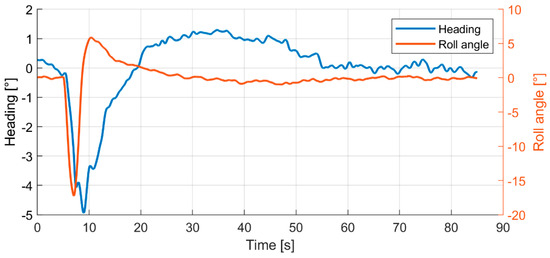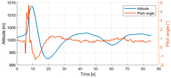 Example results show stabilization performance in case of atmospheric disturbance that causes pitch and roll rate 15°/s increase for 2 s (Figure 9 and Figure 10). In this scenario, both altitude and heading channels are affected simultaneously. In the beginning, the airplane is in a stabilized cruise flight, and the disturbance starts at the 5th second of the simulation. The shape of the responses is also influenced by the Dryden turbulence used in the environment model. Initially, the disturbance causes an altitude increase of 14 m and a heading decrease of −5°. As a result, the pitch angle rises to 4.9°, and the roll angle decreases to −17°. The system stabilizes initial disturbance after about 25 s in altitude with undershoot reaching 7.5 m at 19 s of simulation. Pitch angle stabilizes after 15 s from disturbance start (Figure 9). Heading and roll angles stabilize after 15 s from the disturbance occurrence with a small 1° overshoot (Figure 10). Figure 11 shows elevator, aileron and rudder trim tab angles commanded by the stabilization system controller and corresponding primary control surfaces deflections. The graphs are limited to 20 s of simulation because the deflections were stable after that time. Those example simulation results prove the achieved effectiveness of the flight stabilization system using trimming tabs.