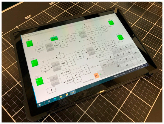 The set of tests preceded the installation of the stabilization system’s hardware modules on the airplane, according to the DO-160G environmental standard requirements. After passing laboratory tests [12,13], the system was installed on PZL 130 TC-II Orlik airplane (Figure 12) and underwent ground tests performed under the supervision of the Polish Civil Aviation Authority. Ground tests covered typical checks: electrical wiring, trim tab calibration and polarity, interface, cabin controls, emergency cut-off, failure detection, diagnostics. In addition, a special application installed on the dedicated ruggedized laptop with a touch screen interface (Figure 13) was developed to handle diagnostics and calibration of the system at the aircraft.