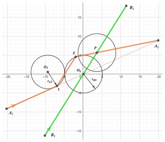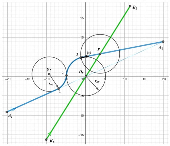 To determine the Dubins trajectory for aircraft A, we use circles and with radii, respectively, and . Considering that the movement of aircraft A takes place along the perimeter of the circle , and the movement of aircraft B through its center, and taking into account the minimum separation used, it was assumed that . The optimization method presented in Section 2.3 ensures that primary conflict at point is not moved to the new conflicting point (Figure 2).