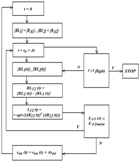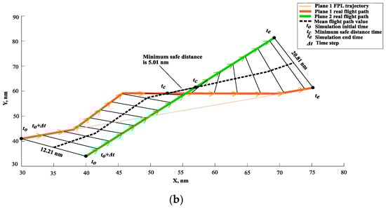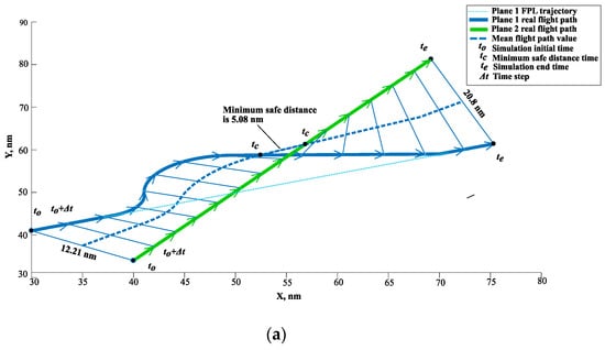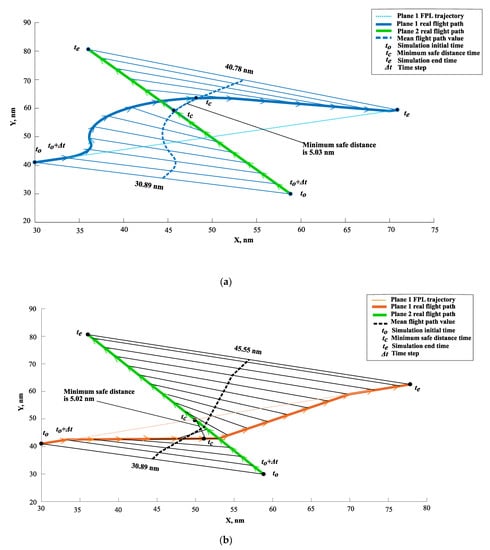When a potential loss of separation of one against the other aircraft is predicted, such aircraft have to be re-routed by safe systems and reliable methods []. Loss of separation (LOS) between aircraft or a conflict occurs whenever specified separation minima between those aircraft are breached, i.e., when they move towards each other, and it is predicted that they will violate their protected zones related to standard horizontal separation (usually 5 nm) and/or vertical separation (usually 1000 ft) [,,]. The problem to be analyzed so as to assure specified separation between aircraft when both planes fly en route and a potential LOS at a specified time has been identified.