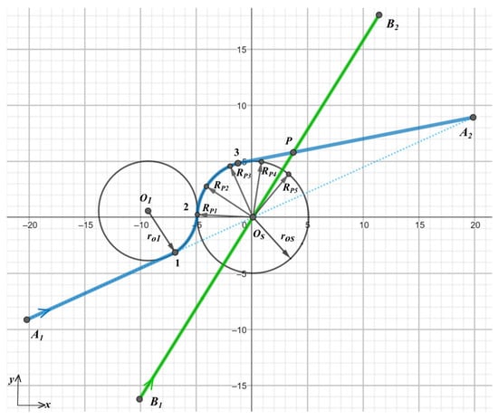 At characteristic point 3, aircraft A terminates the circular motion and begins to move straight down to the trajectory endpoint. We may identify characteristic point 3 as the point where a straight line passing through the point is tangent to the circle . Two cases should be considered.