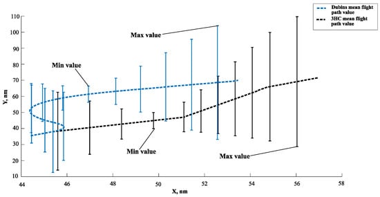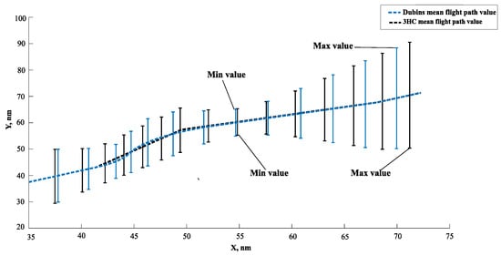 The Dubins and 3HC mean flight path distance values, taking both minimum and maximum values when the angle (for both trajectories) at the starting point of the simulation is 90°, are shown in Figure 9.