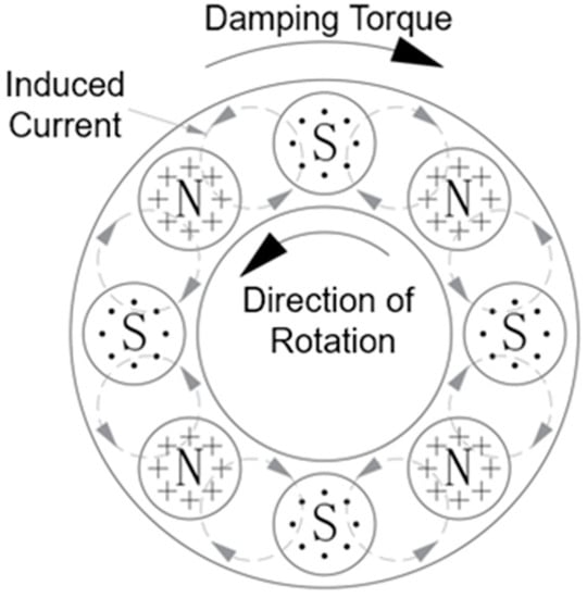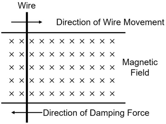 From the theorem of electromagnetic induction, it is known that the movement of a wire cutting magnetic induction lines in a magnetic field will produce an induced current, and according to the Lenz’s law, the magnetic field of the induced current will impede the movement of the wire in the magnetic field. In addition, due to the resistance of the wire itself, the induced current flowing through the wire will cause the kinetic energy of the wire to be dissipated as heat energy, thus achieving the effect of impeding the movement [], as shown in Figure 1.