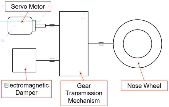 The overall design of the structure of the electrically actuated nose wheel steering system uses a gear-driven steering mechanism, and the electromagnetic damper is reasonably installed to better achieve the shimmy reduction function. As shown in Figure 4, the electrically actuated nose wheel steering system includes the transmission mechanism, power output source and other components. The power of the steering mechanism is provided by a servo motor, while the gear transmission mode is selected for the transmission mechanism. Other components include an electromagnetic damper, angle sensors, load sensors, etc.