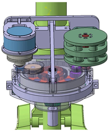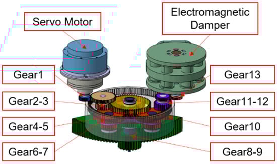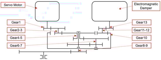 The schematic diagram of the gear reducer is shown in Figure 5 and the specific structural scheme design is shown in Figure 6. The nose landing gear shimmy reduction channel and the steering channel are connected in parallel in the same gear transmission mechanism. The reducer is a fixed axis gear train during the steering operation of the nose landing gear. Motor shaft gear 1 engages with gear 2, gear 2 is coaxial with 3, gear 3 engages with 4, gear 4 and 5 are duplex gears, gear 6 engages with gear 5, gear 7 is coaxial with 6 and engages with gear 8, gear 8 is coaxial with gear 9, and finally passes to the front landing gear strut gear 12. When the shimmy reduction maneuver is performed, the reducer is a compound gear train, meanwhile, gears 6–7 are planetary gears, and gears 4, 5, 8, 9 are center gears. The motor shaft is braked, the electromagnetic damper gear shaft is the input shaft, gear 13 engages with 12, gear 12 is coaxial with 11, and gear 11 engages with gear 10, driving gears 6–7 to rotate around the center gear and to be able to rotate at the same time, eventually passing to the nose landing gear strut gear 12.