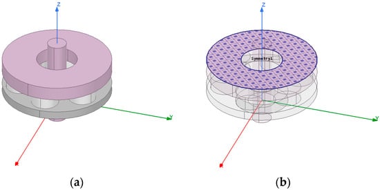 Finite element simulation model of the electromagnetic damper: (a) Simplified model; (b) Central cross section of the stator disk.
