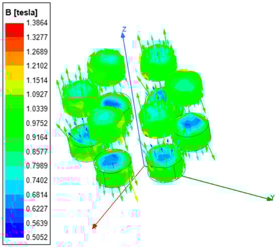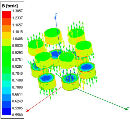 Firstly, the parameters of relative permeability, conductivity and coercivity of the permanent magnet poles are corrected, and the simulation results of the magnetic flux density of magnetic poles are shown in Figure 10. The magnetic field strength directions of the adjacent magnetic poles are opposite, and the magnetic flux density provided by each pole is calculated between 0.852–0.865 T by the fields calculator, which is basically consistent with the properties of the permanent magnet actually selected for this scheme.