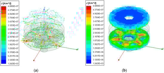 When an alternating current, especially a high frequency current, flows through a conductor, it will tend to the conductor surface and flow in a thin layer near the surface, which is the skin effect in electromagnetic field theory []. As can be seen from Figure 3, the rotor disks generates eddy currents with alternating directions during rotating around the stator disk.