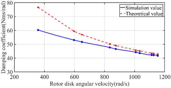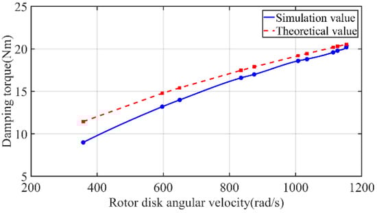 The resistivity of steel 1010 is 5 × 10−7 Ωm and the permeability is 1.8 × 10−3 H/m. This scheme uses a permanent magnet with the magnetic flux density of 0.86 T. Assuming that the air gap between the magnetic pole of the permanent magnet and the rotor disk is small enough. In order to meet the target of the damping coefficient of not less than 40 Nms/rad, according to Equations (18) and (21), dimensions of electromagnetic damper components can be obtained which are shown in Table 3.