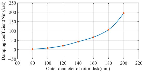From Figure 18, it can be seen that by changing the dimensions of the electromagnetic damper, the damping coefficient amplified by the transmission mechanism ranges from 2.83 to 195.29 Nms/rad, and there is an approximate quadratic power relationship with the dimensions of the rotor disks of the electromagnetic damper, which once again verifies the correctness of the derivation of the damping coefficient in the mathematical model.