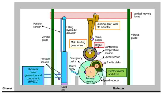 The iron bird, whose schematic is depicted in Figure 1, is based upon a fixed mechanical structure and a moving platform integral with the landing gear leg, complete with a wheel and electrical brake. The platform slides along low friction vertical guides according to the force provided by an electro-hydraulic servoactuator. A 160 L/min three-stage servovalve is used to control the flowrates according to the commands provided by the test rig control system. A calibrated by-pass orifice connects the two hydraulic lines serving the actuator to improve the dynamic response of the force-controlled system. The sensor suite includes one linear variable differential transformer (LVDT) sensor monitoring the hydraulic actuator travel, and a load cell measuring the force exchanged between the actuator and the moving platform. The hydraulic power necessary for the actuator operation is provided by a dedicated power generation unit operating at 207 bar.