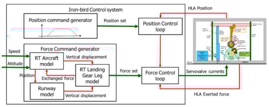 The iron bird operation is managed by an engineering test station (ETS), which accepts the inputs from a central control unit (CCU) that in turn receives the commands from an operator via a user interface. As depicted in Figure 2, both the input data and the rig signals are sent to a dedicated computer running the real-time (RT) simulation of the aircraft conditions. The control system was designed to combine a position control loop to descend the moving platform until the wheel makes contact with the runway simulator and a force control loop to simulate the effects of the landing procedure on the landing gear leg. The real-time simulation was based upon three modules: the aircraft dynamics module receives as input the linear speed of the runway simulator and computes the expected position of the vehicle along the runway, along with the forces exchanged between the airframe and the landing gears. The runway module is used to generate the contact surface at the interface between the wheel and the runway, allowing for the introduction of waving or pavement irregularities. Finally, real-time landing gear models are used to link the aircraft with the runway and compute the force that must be imposed by the hydraulic load actuator (HLA) to replicate the aircraft behavior foreseen by the aircraft real-time model in the article.