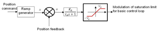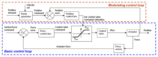 Control of the moving platform is obtained through a combination of a basic control loop, regulating the force exerted by the hydraulic actuator, and a modulating control loop, which is used to manage the moving platform approach and retrieval at the beginning and at the end of each test. The general architecture of the two control loops and their interactions are described in Figure 3. The basic control loop implements a closed loop force control that compares the vertical force command with the actual force exerted by the HLA measured by the load cell installed on the test rig. A force error is then obtained and processed by a suitable control law, thus generating a control signal for the three-stage servovalve. Before reaching the servovalve, this signal is limited by a dynamic saturation block, where the upper and lower bounds are defined by the modulating control loop.