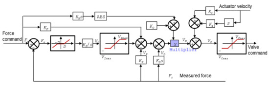 The control law for the basic control loop is instead depicted in Figure 5. The employed architecture implements a force control system similar to those provided in other demanding applications such as iron birds for flight control systems [12,13] and test rigs for actuators under PHM experimentation [14]. The control law is based upon a modified PID controller, where the integral contribute is computed on the error between the force set and force feedback , while both the proportional ) and the derivative signals act directly on the feedback, while a feedforward of the force command is added to improve the system dynamics. As described in Equation (1), a feedforward signal of the time derivative of the force command, saturated between zero and a maximum value, is then used in conjunction with the fixed gain to increase the system response to quick variations of the set by increasing the voltage applied to the servovalve coils.