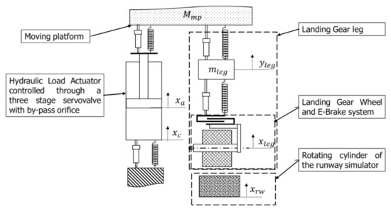 where is the cylinder movement. The attachments on both sides of the actuator were modeled as viscoelastic components to account for their deformation. The vertical dynamics of the assembly including the moving platform and the test article were modeled according to the scheme provided in Figure 7. In the absence of a detailed mass breakdown, the moving platform is connected to the mass m, representative of the single landing gear (LG) leg, by a non-linear spring-damper element representative of the shock-absorber. On the other side, the eventual viscoelastic contact between the LG tires and the runway simulator is represented. The dynamic equilibrium of the moving platform can then be represented considering the following equation, where is the vertical displacement of the leg, while and are the shock absorber stiffness and damping. is the preload of the shock absorber.