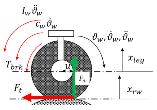where and are the stiffness and damping coefficient representative of the tire-runway simulator contact, respectively, while and are respectively the vertical displacement of the wheel and that of the runway simulator, by default equal to zero. The wheel mass is . Please note that the force exerted by the contact between the tire and the rotating cylinder can only apply a compressive load on the leg. The characteristics of the tire are derived from data provided by the industrial partners. The rotational dynamics of the wheel can be described according to the free-body diagram of Figure 8. With the vertical force exchanged between the wheel and the runway simulator, with the friction force and with the rolling friction parameter, function of the wheel angular frequency, and of the tire pressure [16], we can obtain: