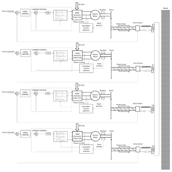 The E-Brake system is made of four electro-mechanical actuators (EMAs) controlled in force and acting in parallel on a disk brake. The functional scheme of the system is reported in Figure 9. Each actuator is driven by a brushless-DC motor connected to the braking pad though a gearbox and a ballscrew each. Each actuator was equipped with a dedicated load cell used to measure the exerted force and close the force control loop. The model of the actuators control system was similar to that of the testbench, where a sequence of proportional-integrative controllers operated on the force control loop and the current control loop of each brushless motor. The sensor suit was modeled through second order transfer functions replicating the expected dynamics of the load cell and of the Hall-effect sensors employed to monitor the angular position of the brushless-DC rotor. The simulation of the measure chain is completed with the model of the employed A/D converters. The dynamic model of each EMA is derived from the simulation models previously employed for prognostic activities on flight control systems [18]. The electronic power converter was modeled as a three-phase inverter with pulse width modulation (PWM) following the functional modeling provided in [19]. An initial value of 10 kHz was chosen for the carrier frequency of the PWM modulator. The electrical dynamics of the motor can be described according to a streamlined three-phase model of the system.