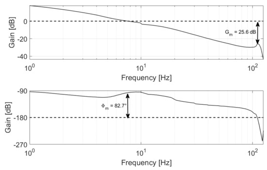 The only purpose of the position control loop is to manage the moving platform at the start and at the end of each test, conceding priority to the force control loop during the landing test procedure. During these phases, the system is commanded through slow position ramps, with the sole purpose of limiting the descent speed of the moving platform, thus removing the need for strict requirements over its dynamic performance. The force control loop is critical to the system behavior and is thus studied in detail. The selected gains of the force control loop provide sufficient stability margins. As depicted in Figure 10, the gain margin can be estimated as 25.6 dB, while the phase margin is equal to 82.7°, which are well above the usual requirements of 6 dB and 60°, respectively.