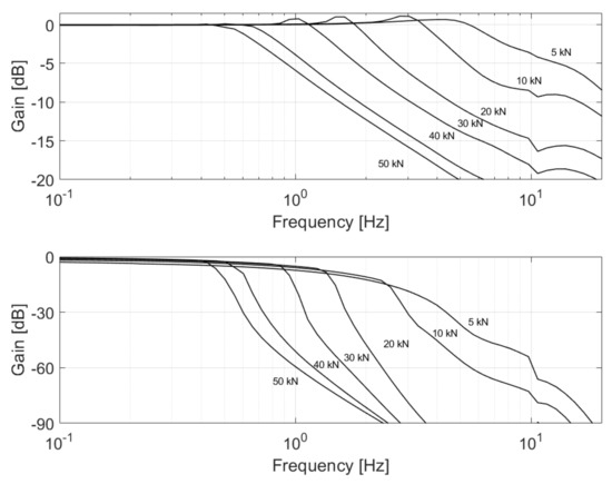 The closed loop response of the force control system is depicted in Figure 11 as a function of the command amplitude. The bandwidth, defined as the frequency associated with a closed loop gain equal to −3 dB, is heavily dependent on the amplitude of the force command imposed on the system, reaching 8.9 Hz for a ±5 kN sinusoidal set while falling below 1 Hz for command amplitudes higher than 40 kN. The system exhibits the tendency to slightly overshoot within frequency ranges dependent on the command itself. However, these peaks are deemed acceptable since they are modest in value, lower than 1 dB, and mostly affect the low-amplitude commands, tending to disappear as the command amplitude rises.