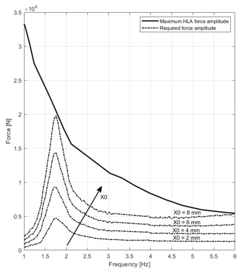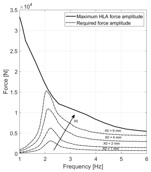 To better highlight the test bench capabilities, the maximum amplitude of the force exerted by the hydraulic actuator was compared with the amplitude of the sinusoidal load acting on the landing gear leg due to runway irregularities with varying frequency of occurrence and different amplitudes X0 in Figure 12. Since the frequency of the dynamic load due to the sinusoidal runway irregularities depends on the aircraft speed along the runway, the test bench must be able to provide a force at least equal to the required one for the entire frequency range representative of the aircraft operating conditions. For example, to reproduce the landing of an aircraft approaching the runway with an expected horizontal speed of 60 m/s in the presence of periodical irregularities with 10 m pitch and given amplitude, the test rig must be able to generate, on the landing gear, a sinusoidal force at least equal to the required one for the whole frequency range up to 6 Hz. The most critical conditions occur in correspondence of the first resonant frequency of the landing gear leg, which occurs in the proximity of 2.25 Hz. As depicted in Figure 12, the test bench is expected to reproduce a maximum amplitude of periodical runway irregularities equal or lower than 6 mm. Higher amplitude irregularities can still be reproduced, provided that the ratio between the aircraft speed and the waving pitch causes force oscillations at lower frequencies. For example, irregularities with 20 mm amplitudes can be successfully replicated if their frequency drops below 1.67 Hz, which corresponds to a waving pitch of 35.9 m for an aircraft approaching the runway with a horizontal speed of 60 m/s. Figure 13 details the operating envelope of the test rig, depicting for several values of runway waving amplitude and the minimum pitch that allows its representation on the iron bird.