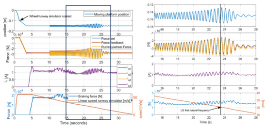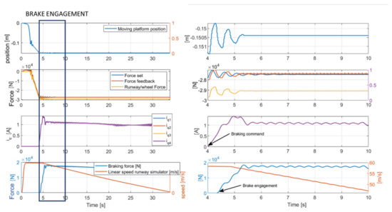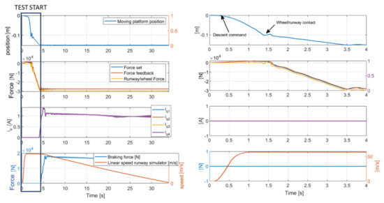 As depicted in Figure 14, the test begins by supplying a positive force command to the force control loop and a set signal equal to zero to the position control loop, both of which are needed to balance the combined weight of the landing gear leg, the hydraulic actuator rod, and the moving platform itself. At the same time, the runway simulator is accelerated through a dedicated electric motor, until its tip speed reaches the value coherent with the desired horizontal speed at landing. Please be mindful that this particular phase is expected to require a few minutes due to the high resistance opposed by the inertia disks and was artificially accelerated in the simulations. Once the descent command is provided, the real-time aircraft model is activated and begins to provide the force set as defined in Section 2, causing the slow descent of the moving platform. After contact is made between the wheel and the runway simulator, the position set is quickly brought to a value to negate the effects of the position control loop over the force regulation, thus allowing the system test rig to apply the load calculated by the real-time aircraft model. In response to a dedicated command provided by the iron bird control unit, the electromechanical brakes are engaged and start decelerating the runway simulator. The dynamics of this process is depicted in Figure 15, where the behavior of the quadrature currents of the four electric motors acting on the E-Brake system can be observed. The delay between the braking command and the effective brake engagement is due to the dynamics of the electro-mechanical actuators and the need to cover the initial gap separating the brake’s pads from the brake’s disks. The resultant braking force is then modulated by the anti-skid system to avoid the wheel blockage until the runway simulator is brought to a standstill.