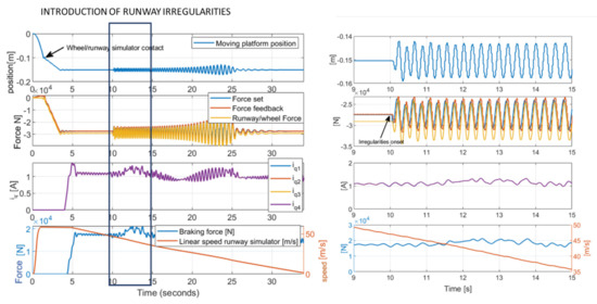 Moreover, the development of a scalable test rig can reduce the cost of testing and certification of future platforms. Finally, although not foreseen within the boundaries of this research program, a scalable test-bench could represent the aircraft behavior and thus the landing gear and E-Brake system operations during challenging conditions such as crosswind landing. Additional inertia disks required to represent the increased weight of the aircraft can be easily mounted on the runway simulator, provided that the mechanical components of the structure are properly sized. The hydraulic system is, on the other hand, capable of sustaining a modest increase in the aircraft mass, and thus the load, without significant loss in performance or in functionality. For the executive transport aircraft under consideration, an additional mass up to 15% of the previously considered value is considered compatible with an emergency landing executed close to take-off. As depicted in Figure 18, the test rig is able to reproduce the effects of runway irregularities, even in the presence of this additional mass.