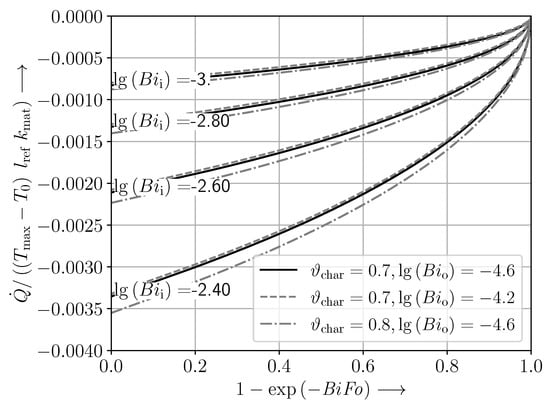 The non-dimensional transient heat transfer map derived from FEM simulation for a given step change of  is shown in Figure 4 for sets of parameters , , and . It becomes obvious that the variation of the non-dimensional heat transfer map as a function of these parameters is relevant.