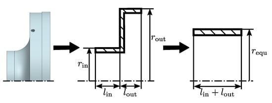 The two parts of the centrifugal compressor’s casing feature different radii. The casing is, therefore, modeled as an equivalent pipe (see Figure 10). This approach ensures consistency with the assumptions underlying the non-dimensional transient heat transfer maps. This equivalent radius  is calculated by requiring that the heat flow due to free convection stays the same for the equivalent pipe,