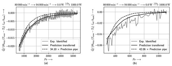 One experimentally-identified step response of the compressor’s non-dimensional transient heat flow is shown in Figure 12a. It features significant noise. This is attributed to the correction of the temperature readings, as described in Equation (24). In Figure 12a, the prediction of the original network, that represents the thermal transient of a pipe, is compared to the prediction of the transferred neural network. The prediction of the original network needs to be scaled to meet the range of the measured data. The scaling factor is displayed in the legend of Figure 12. However, the thermal transient of the compressor is slower due to the large thermal mass of the compressor’s impeller and its bladed diffuser. Hence, it is the step of transfer learning which improves the prediction by matching not only the measured range but also the time constant. This is visible by comparing the rise times of the two different predictions shown in Figure 12a.