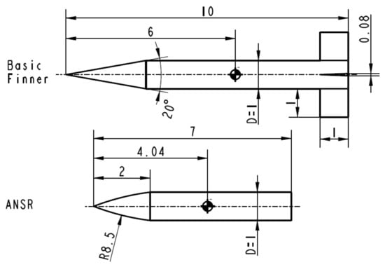 The Basic Finner [] has been chosen as a reference model due to its relatively high pitch damping moment coefficient sum while the 7 cal. Army-Navy Spinner Rocket (ANSR) serves as a low-damping reference model. Results from free-flight tests at transonic and supersonic Mach numbers as well as from CFD investigations are available in the literature for both configurations [,,,,]. The caliber D of both models is 20 mm. This results in a blockage ratio of 0.26% in relation to the wind tunnel cross-section. The model dimensions are shown in Figure 2.