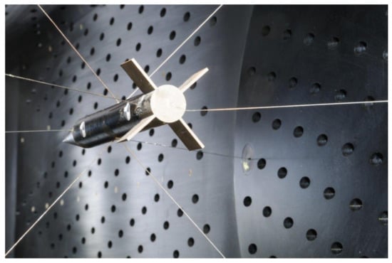 Although CFD methods are improving, there is still a need for experimental reference data. The experimental methods most commonly used for projectile design are free-flight tests []. However, flight test results commonly show high scatter and large uncertainties close to Mach 1 []. Therefore, there is a need for an experimental method that allows for precise measurements of . Various methods for its experimental determination in a wind tunnel setup have been developed [,], but are often not well suited for testing projectile configurations at transonic Mach numbers. The main reason for this is support interferences due to the combination of small model sizes and the larger sting support necessary for the dynamic tests, which result in large measurement uncertainties. In addition, wall interference can be a limiting factor, depending on model size and blockage ratio [,]. Therefore, methods like the forced-oscillation technique [] that use a traditional sting support depend on the availability of a sufficiently large wind tunnel.