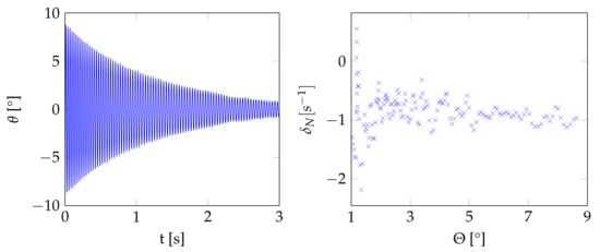 Due to the low dependence on the current amplitude, a constant momentary decay coefficient can be calculated between two subsequent peaks (of maximum displacement) and at times and using the logarithmic decrement method []. The influence of the cubic stiffness term is observed by applying a nonlinear correction factor , which is derived from the perturbation solution [] based on the exact solution to the differential equation . Thus a modified logarithmic decrement method is used to calculate the momentary decay coefficient :