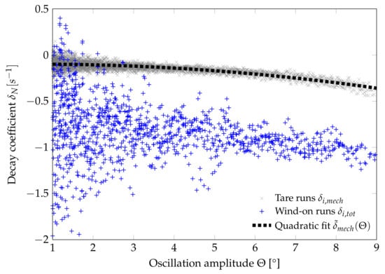 In the next step, the measurements of need to be subtracted from to determine . A weighted least-squares approach is used to calculate a quadratic model function based on the data from the tare runs. The weights are based on the point density over the oscillation amplitude as fewer measurements are available at larger amplitudes. This model is then used to correct the wind-on measurements in order to obtain the aerodynamic damping measurements :