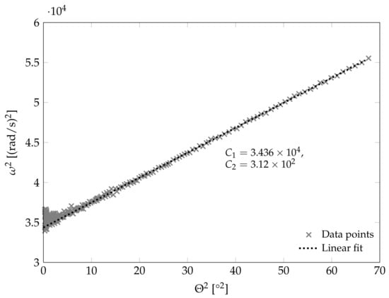 between the oscillation frequency and amplitude allows the determination of both coefficients through a linear least-squares fit. The frequency is determined through the time between the zero crossings of the measured pitching angle. For the least-squares fit the data points are also weighted by the point density. An example for this linear fit is shown in Figure 6.