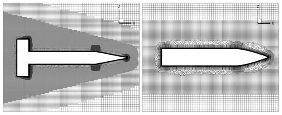 Meshes for both models were created with the Fluent meshing tool. For both models, cylindrical computational domains were used, which extended 250 model diameters downstream of the model. The cylinder radius and the upstream extension were set to 150D. The ANSR mesh consists of cells, the Basic Finner requires some additional refinement due to the fins, its mesh consists of cells. Cut plane sections showing the model outlines for both meshes are shown in Figure 9.